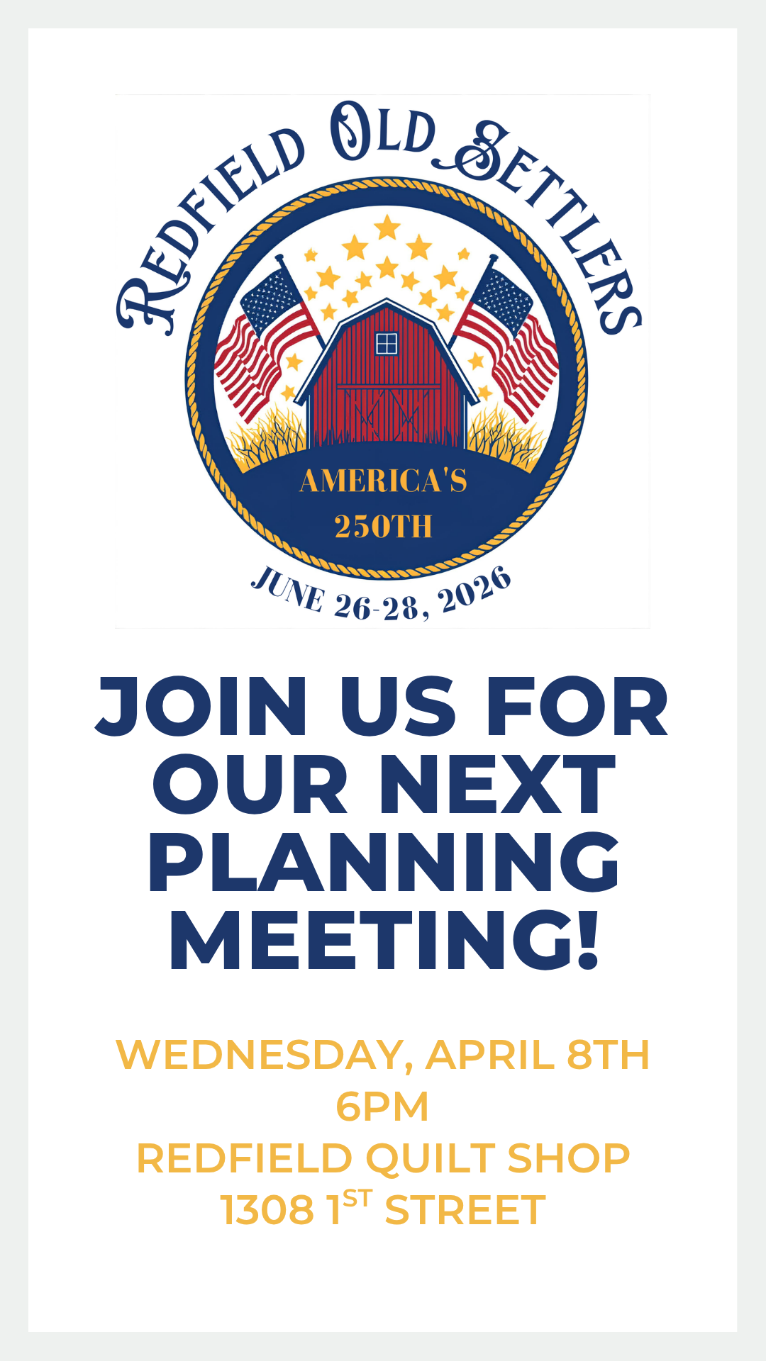 Join us for our next planning meeting on Wednesday, April 8, 2026, at 6:00 PM at the Redfield Quilt Shop, located at 1308 1st Street in Redfield, Iowa.